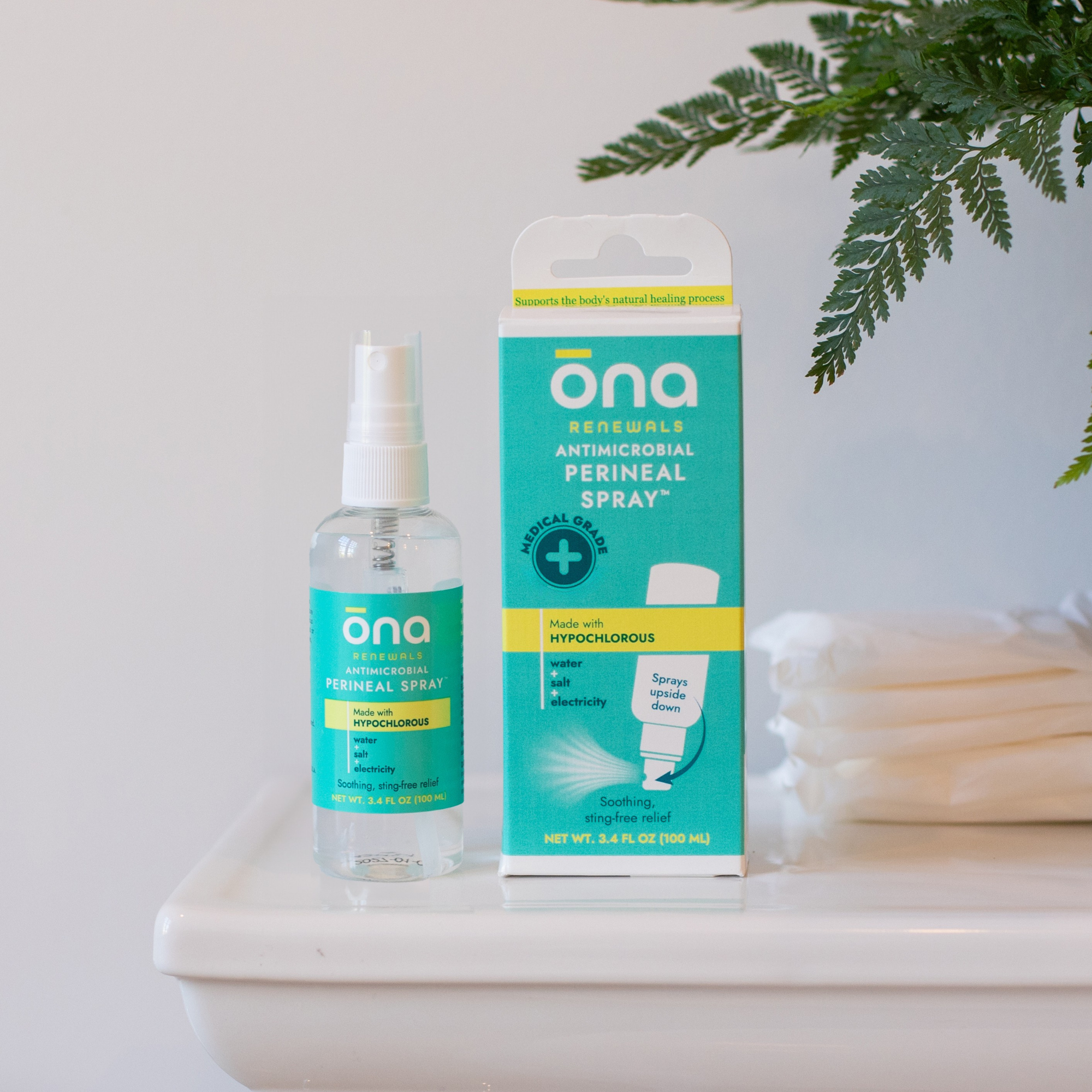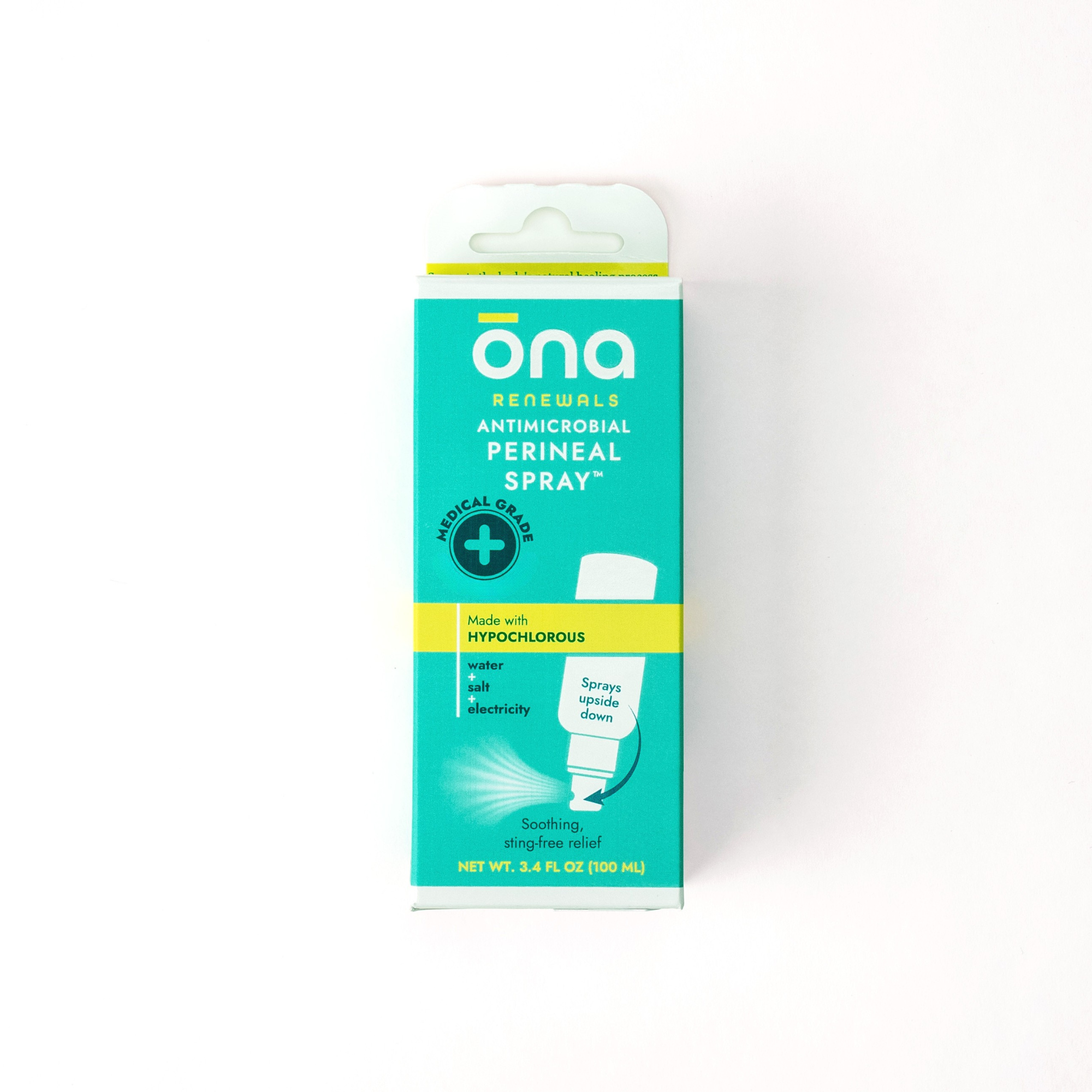ona renewals antimicrobial perineal spray uses an antimicrobial, medical-grade perineal care solution crafted from hypochlorous (HOCl) to help support natural healing and ease postpartum symptoms and irritation.